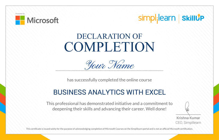 A completion certificate will be awarded upon completing the business analytics with Excel course. This certificate serves as formal recognition of your participation and completion of the Business Analytics with Excel course.