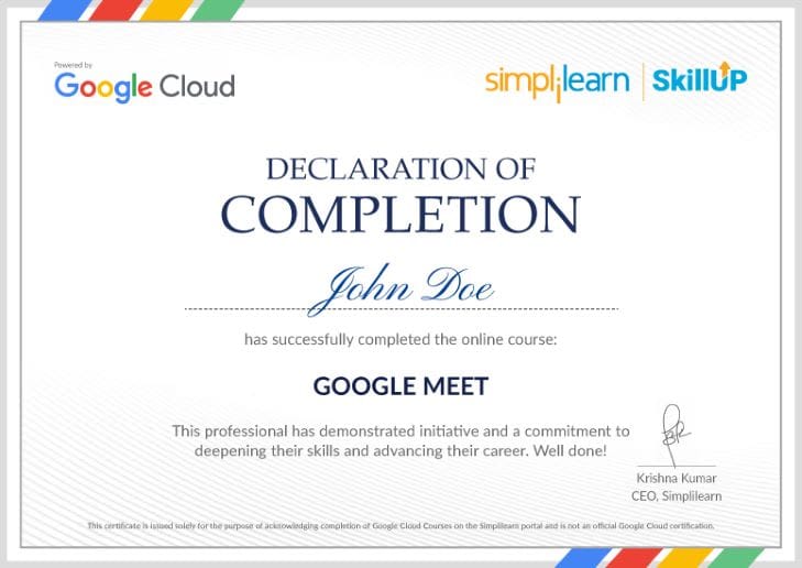 Upon successful completion of the course, you will be awarded with the course completion certificate powered by Google cloud from SkillUp.