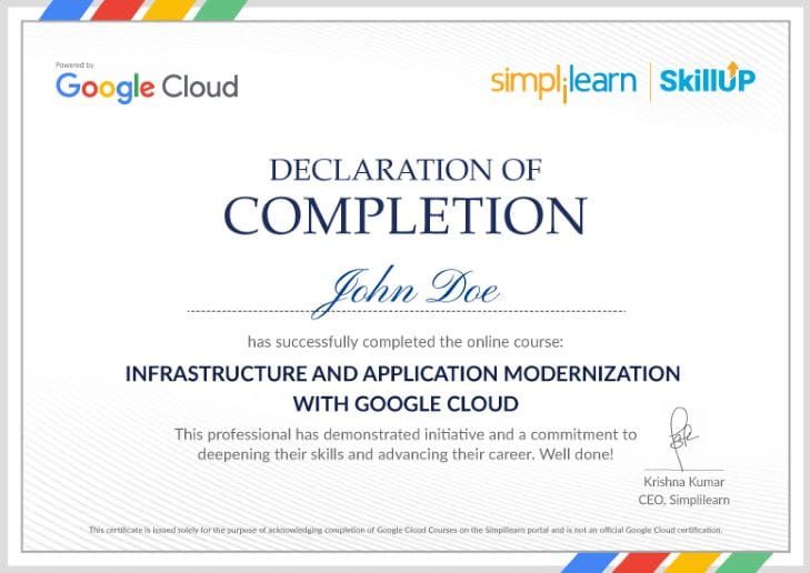 • Will I get a certificate after completing this Infrastructure and Application Modernization course powered by Google Cloud?