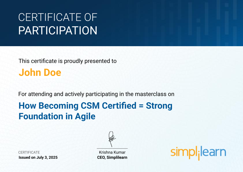 Bonus: Attend and receive an exclusive discount on Simplilearn's CSM Certification Training, plus a certificate of participation to showcase your commitment to your Agile journey.