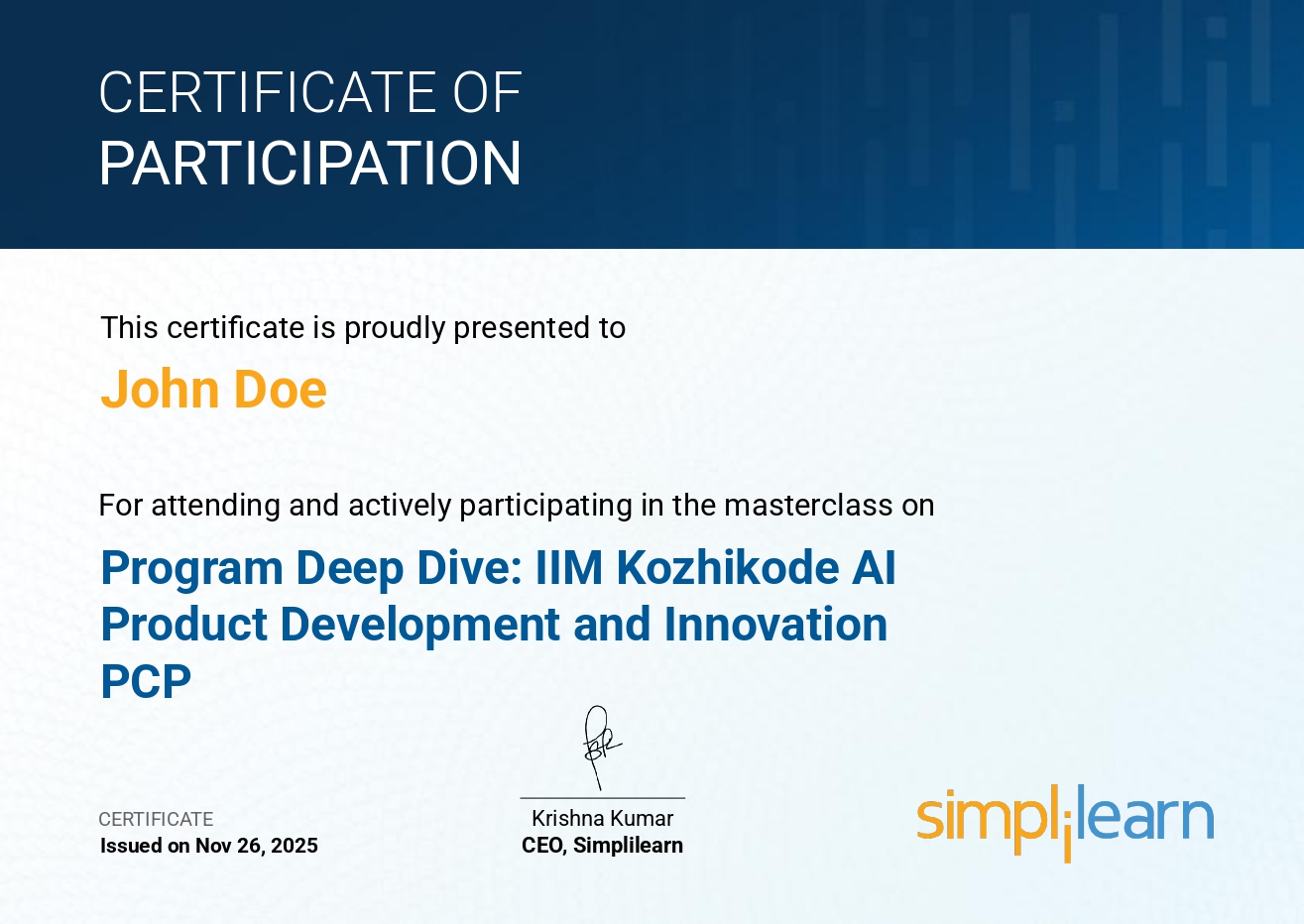 This live session will introduce you to the Professional Certificate Program in AI-Powered Product Development and Innovation, offered by IIM Kozhikode in collaboration with Simplilearn.