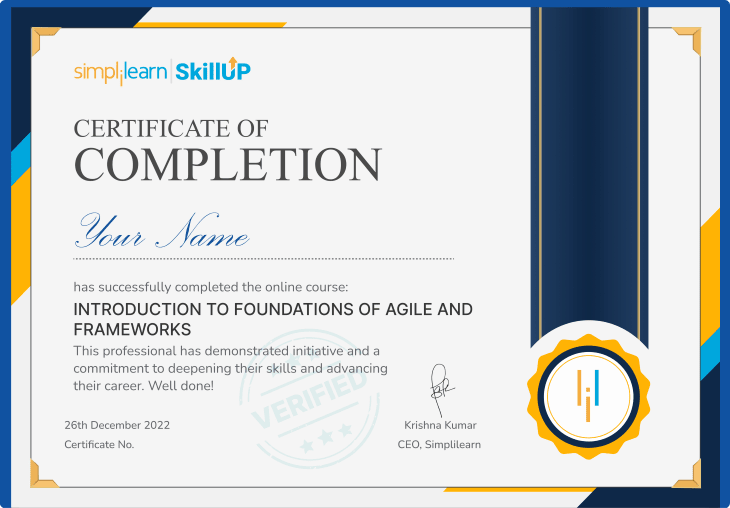 Yes, this certification course is completely free. You can access all modules, learn the agile foundations principles, practices, and frameworks, and earn your certificate of completion at no cost.