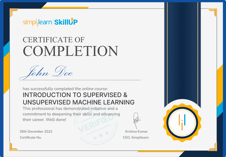 Upon completing the supervised machine learning course, you will receive a certification that validates your understanding and proficiency in supervised machine learning concepts.