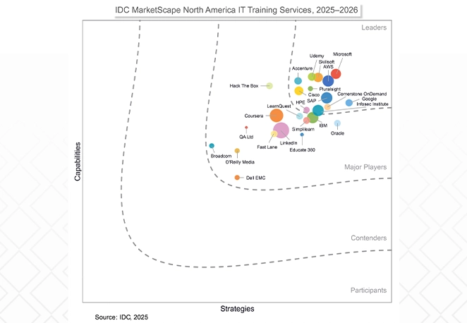 Recognized as a Major Player in the IDC MarketScape: North America IT Training Services 2025–2026 Vendor Assessment for strengths in live learning, analytics and reporting, and partnerships.