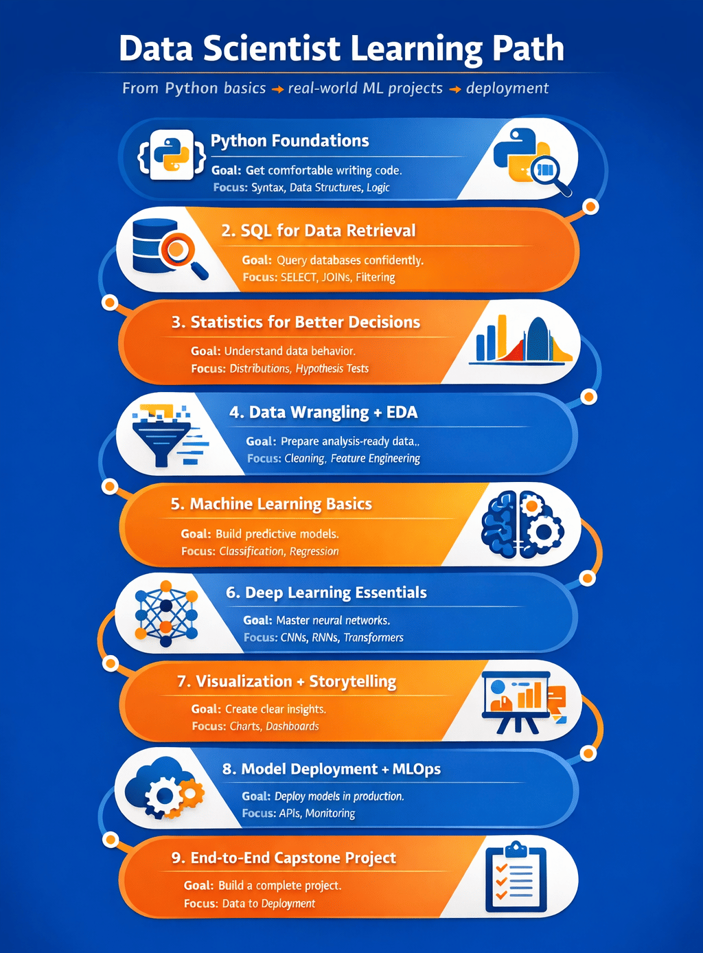 • Becoming a data scientist requires a clear, step-by-step progression that moves from programming and data handling to advanced modeling, deployment, and real-world application