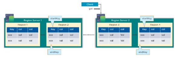 As seen in the below diagram, HBase tables are divided horizontally by row key range into “Regions”. Regions are assigned to the nodes in the cluster, called “Region Servers”. Regions are assigned to the nodes in the cluster, called “Region Servers”. These servers serve data for reading and writing.