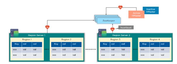The ZooKeeper maintains ephemeral nodes for active sessions via heartbeats to indicate that region servers are up and running.